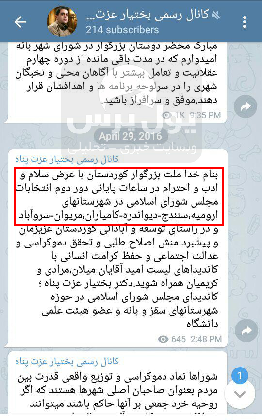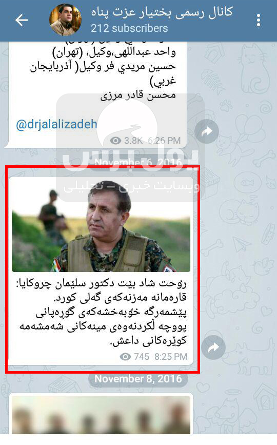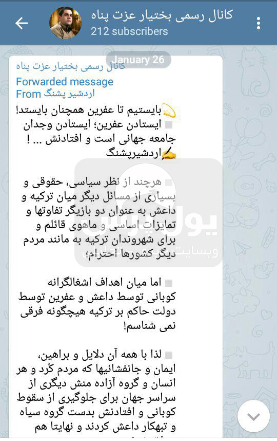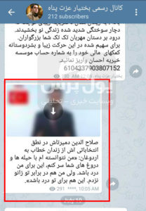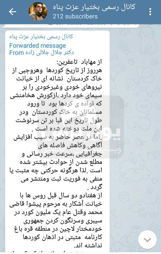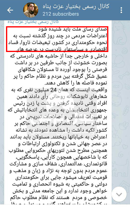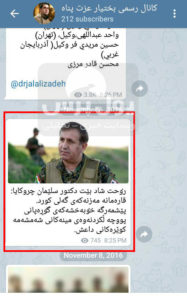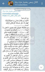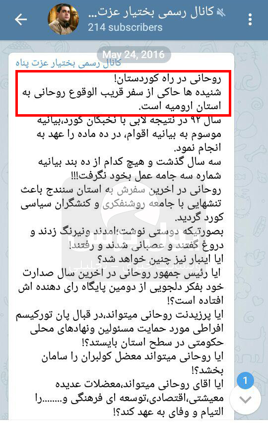 بررسی کانال تلگرامی این شخص نشان از حمایت‌های علنی وی از گروه‌های تروریستی و تجزیه‌طلب پ.ک.ک، دمکرات و تجزیه  منطقه شمال عراق، اشغال کرکوک، حمایت از قاچاق و توهین به مرزبانان و قاتل خواندن آنان و از همه مهم‌تر انتشار مطالبی علیه نحوه حکومتداری در کشور می‌باشد و کلاً اقدامات ضدآذربایجانی وی نشانگر دشمنی دیرین وی با آذربایجان می باشد.