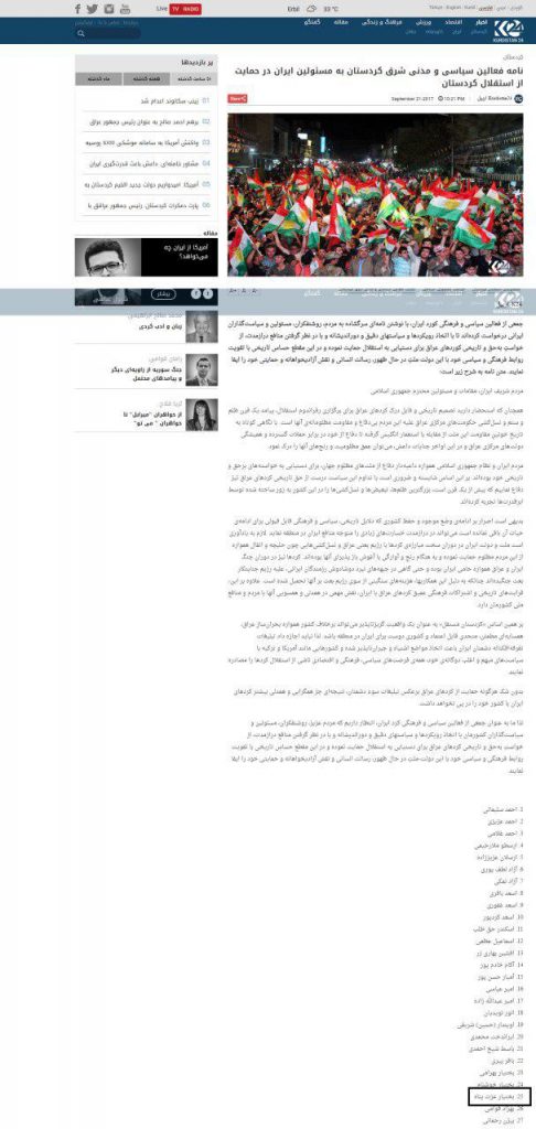 – حمایت از تجزیه عراق و تشکیل کشوری تحت عنوان کردستان در راستای سیاست‌های رژیم صهیونیستی و آمریکا