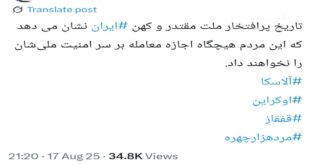 GADTB: İrani rəhbərinin beynəlxalq məsələlər üzrə müşaviri Əliəkbər Vilayətinin avqustun 17-də atdığı tvitlə Trampın Zəngəzur dəhlizi və sülh təşəbbüsü ilə bağlı qəzəbini açıq mbüruzə verib. Həmin tvitdə o, “Alyaska”, “Ukrayna”, “Qafqaz” və “Mərd-e-Hezar-Çehre” (minsifətli kişi) həştəqlərindən istifadə edib. Vilayəti paylaşımında yazıb: “Güclü və qədim İran xalqının qürurlu tarixi göstərir ki, …