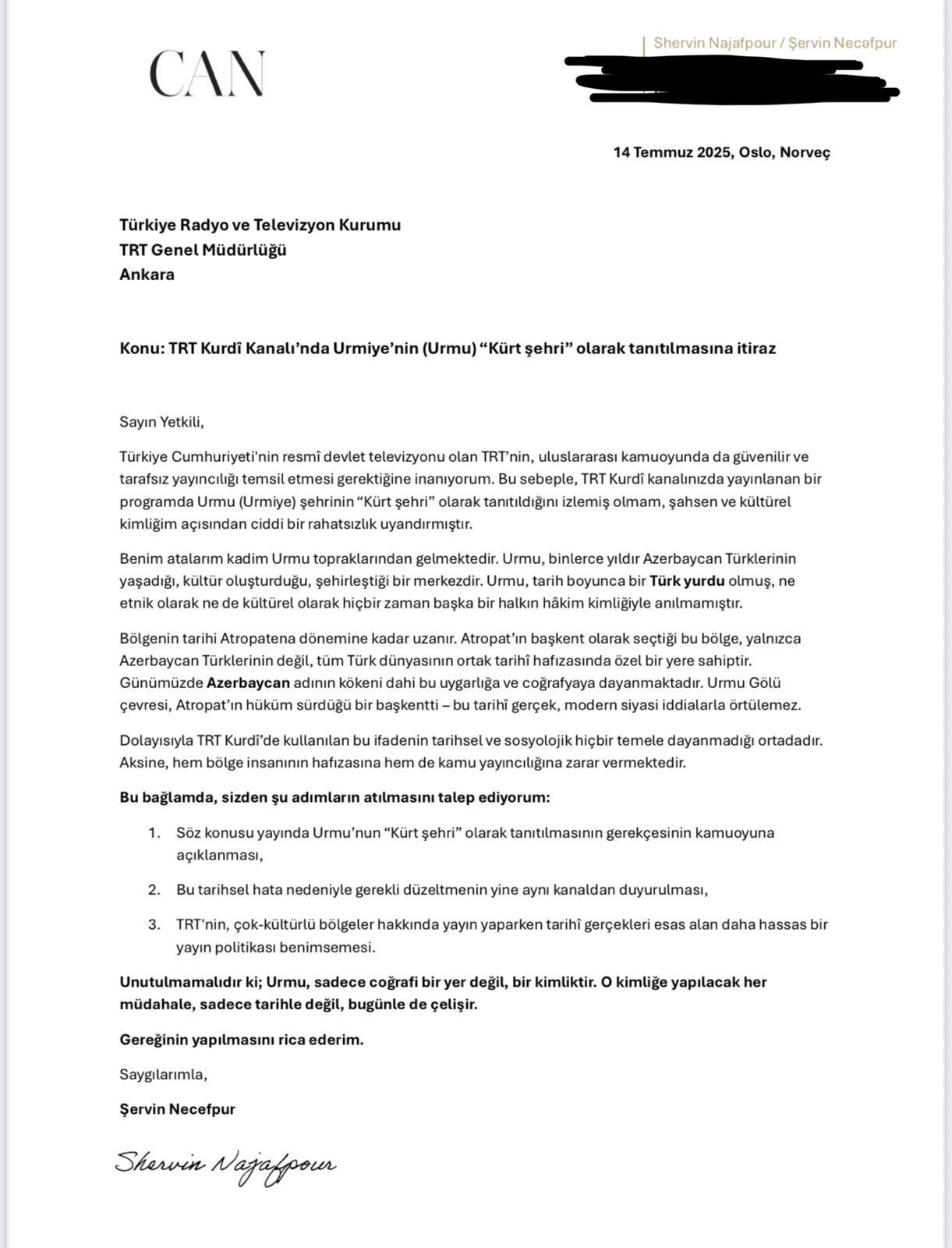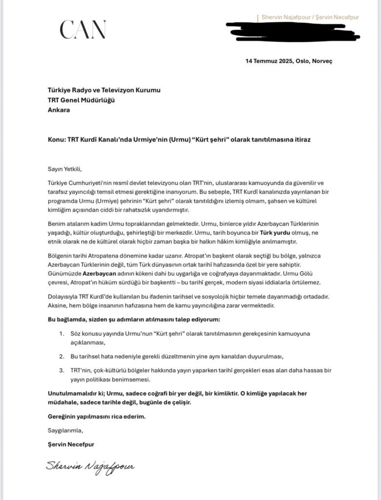 Əslən Urmudan olan, Norveçdə yaşayan və CAN təşkilatının rəhbəri olan sayın Şervin Nəcəfpur Türkiyənin “TRT kurdi” kanalının müdirliyinə rəsmi məktubla etirazını bildirmişdir.