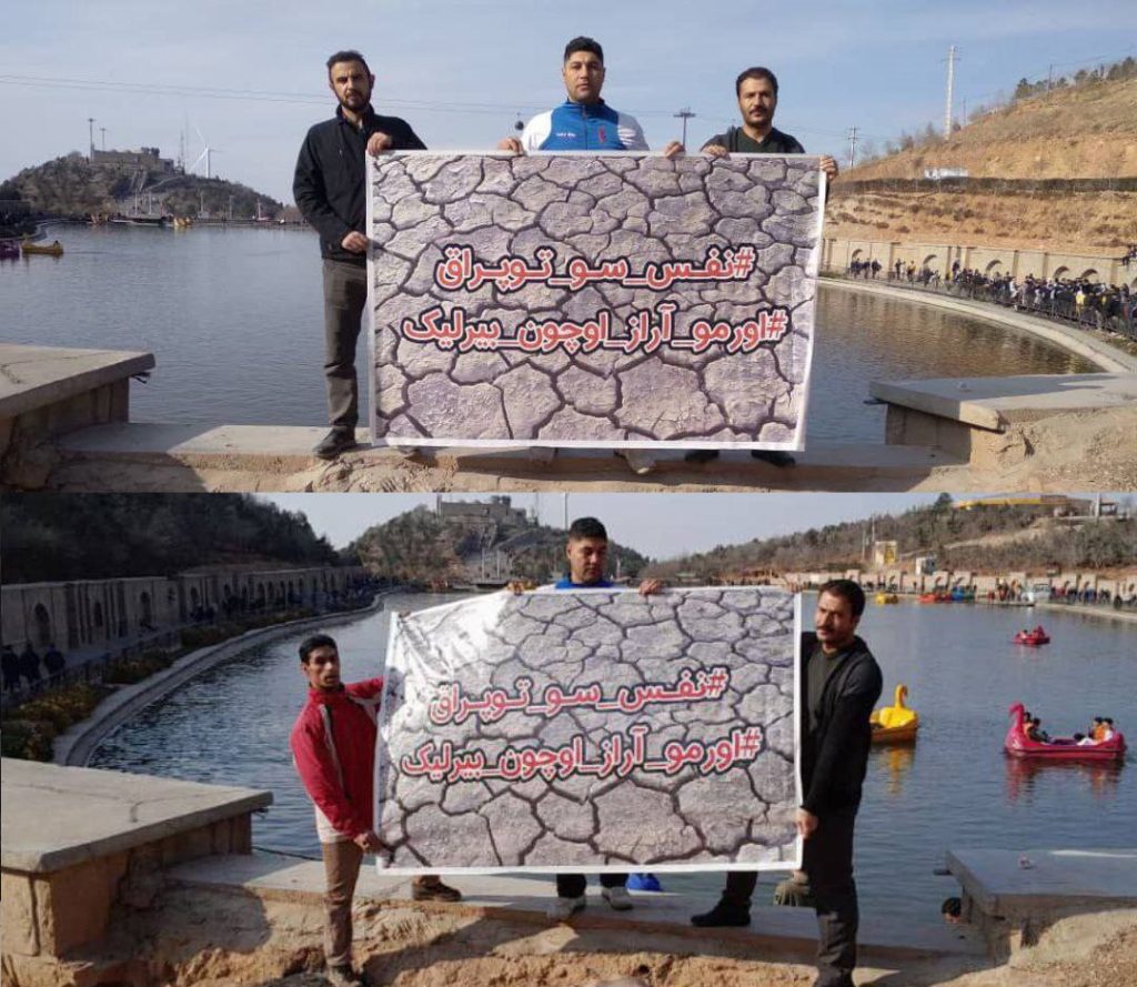 Azərbaycanlı fəalar üzərində “# Nəfəs_Su_Torpaq” və “#Urmu_Araz_üçün_Birlik” yazılmış plakat qaldırarq əhalinin diqqətini qurudulan Urmiya gölü fəlakətinə cəlb etmək istəyiblər.