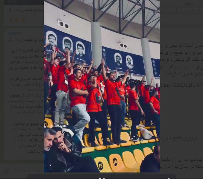 گادتب: هواداران والیبال اورمیه ۲۶ آذر ۱۴۰۴، همزمان با سالگرد ۲۱ آذر۱۳۲۵ روز کتابسوزان در آذربایجان توسط رژیم پهلوی درجریان مسابقه والیبال شهرداری اورمیه و طبیعت اسلامشهر در استادیوم دورنالار یوواسی شهر اورمیه آذربایجان غربی با سردادن شعار «آذربایجان شرفدی، پهلوی بیشرفدی» یاد و خاطره این روز تلخ در تاریخ آذربایجان را گرامی داشتند.