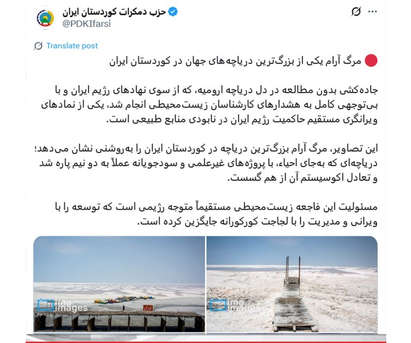 خشکی دریاچه اورمیه یک فاجعه زیست‌محیطی است که تبعات منفی آن مرزهای سیاسی را درخواهد نوردید و طوفان نمک آن به چشم تمامی مردم منطقه فارغ از ملیتشان خواهد رفت. اما این حزب مسلح کرد که اقدامات تروریستی و کشتار مردم را در کارنامه خود دارد این فاجعه زیست محیطی را نیز به ابزاری برای دشمنی و تنش‌آفرینی علیه ملت‌ها در منطقه تبدیل می‌کند.