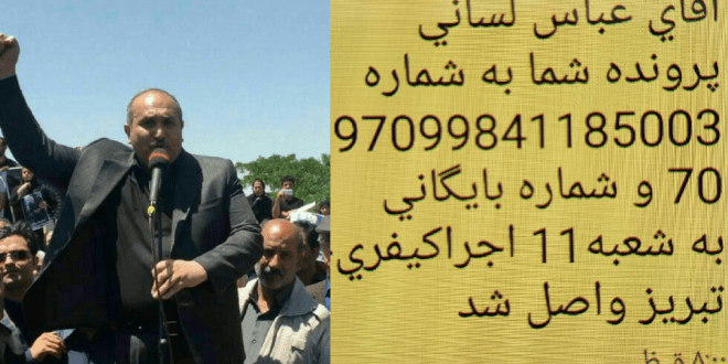 گادتب: به گزارش مرکز خبر گادتب، آقای عباس لسانی فعال ملی آزربایجانى ساکن اردبیل و زندانی سیاسی سابق، امروز شنبه ۱ دی ماه ۱۳۹۷ اساماسی دریافت کرده که در آن از ارسال پرونده شماره ۹۷۰۹۹۸۴۱۱۸۵۰۰۳۷۰ به شعبه ۱۱ اجرای کیفری خبر داده است.