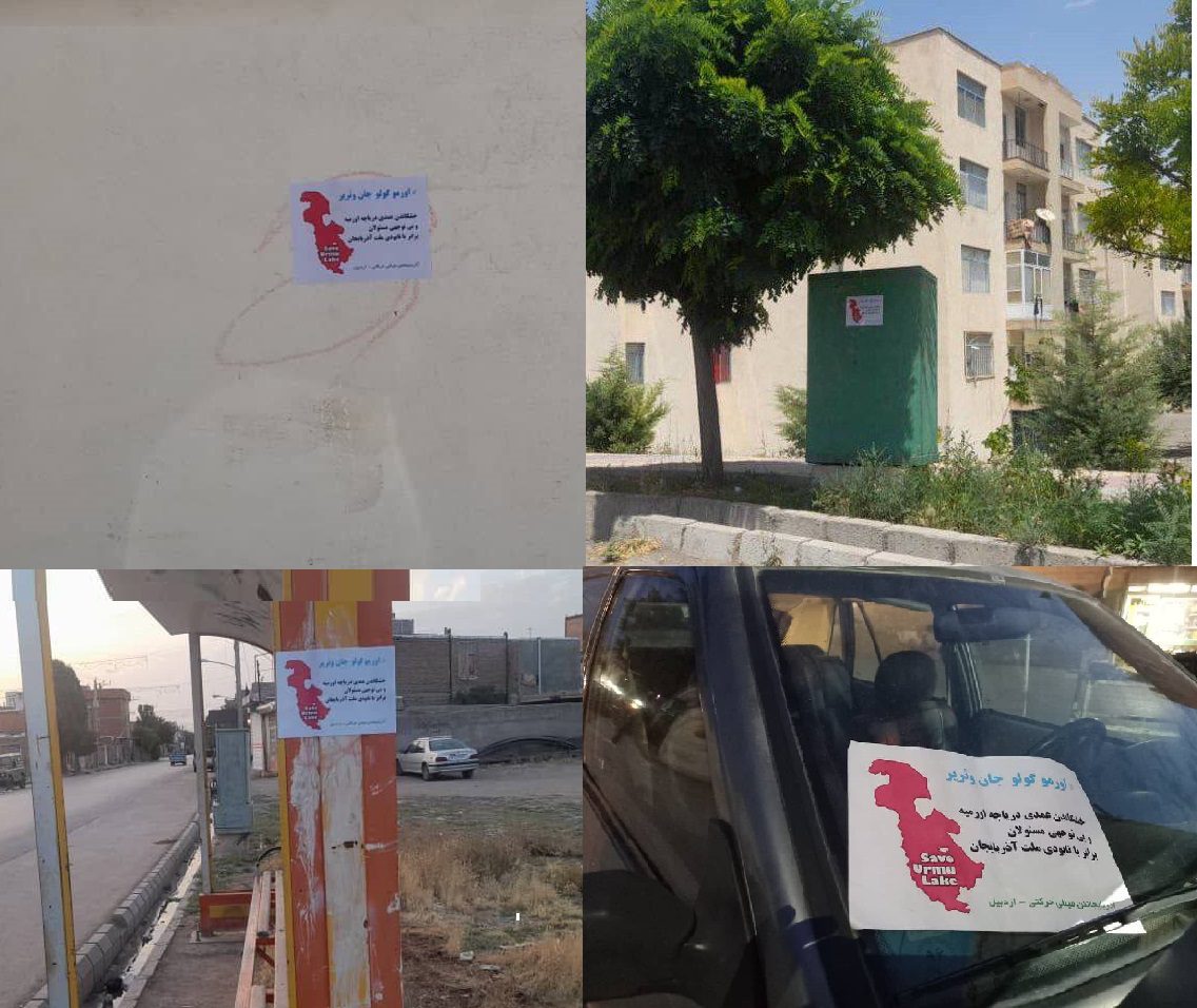 گادتب: فعالین حرکت ملی آذربایجان امروز ۲ مرداد ۱۴۰۲، در اعتراض به وضعیت حاد دریاچه اورمیه با نصب و توزیع تراکت در سطح شهر اردبیل، خواستار پایان بی توجهی مسئولین خشکاندن دریاچه اورمیه شده اند.
