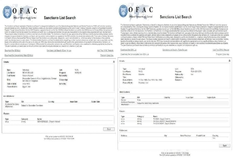 در سند نخست که مربوط به ابراهیم رئیسی است، پس از درج مشخصات فردی او آمده است که بر اساس فرمان اجرایی ۱۳۸۷۶ وزارت خزانهداری ایالات که مربوط به تحریم خامنهای و دفتر وی و افراد مرتبط با او است، رئیسی در فهرست اتباع بهطور ویژه نامگذاری شده (SDN) قرار گرفته و همچینین مشمول تحریمهای ثانویه نیز شده است.