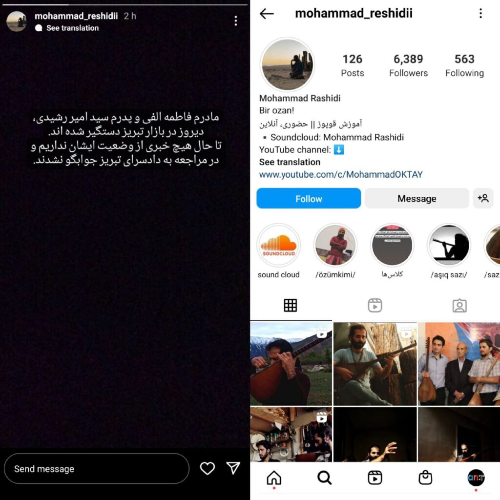 گادتب: به گزارش مرکز خبر گادتب، محمد رشیدی نوازنده و هنرمند آزربایجانی در صفحه اینستاگرامش از بازداشت پدرش سید امیر رشیدی و مادرش خانم فاطمه الفی خبر داد.