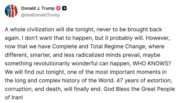 ترامپ در حساب کاربری خود در «تروث سوشال» نوشت: «یک تمدن کامل امشب خواهد مرد و هرگز باز نخواهد گشت.» او با اشاره به سقوط احتمالی ساختار حاکم بر ایران مدعی شد که این اتفاق پایانی بر «۴۷ سال باجگیری، فساد و مرگ» است.