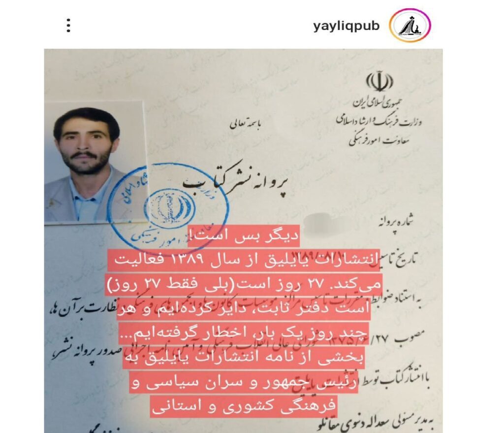 صفحهی اینستاگرامی انتشارات یایلیق با انتشار عکسی از پروانه نشر کتاب همراه با توضیحاتی در اینباره نوشته: