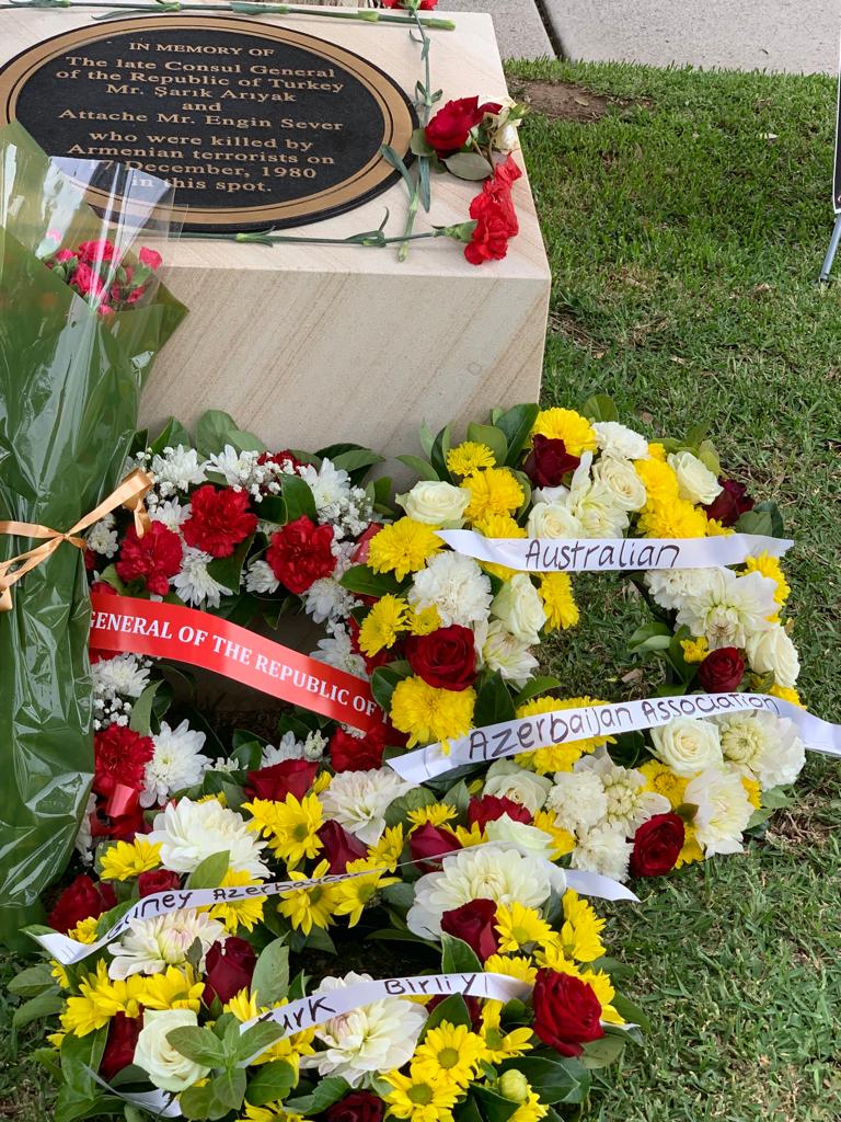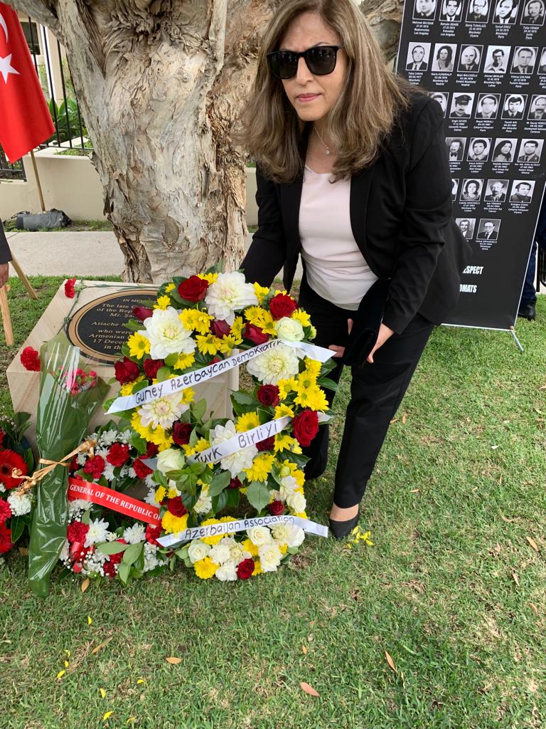 مراسیمده آوسترالیا-آذربایجان آسوسیاسیاسی طرفیندن سایین میکاییل بی اویتا و گونئی آذربایجان دئموکراتیک تورک بیرلیگی (گادتب) طرفیندن سایین سارا خانیم آزرسون تورک شهیدلرینین آابیدهسی قارشیسینا گول چلنگی قویوب خاطرهلرینی سایغی ایله آندیلار.