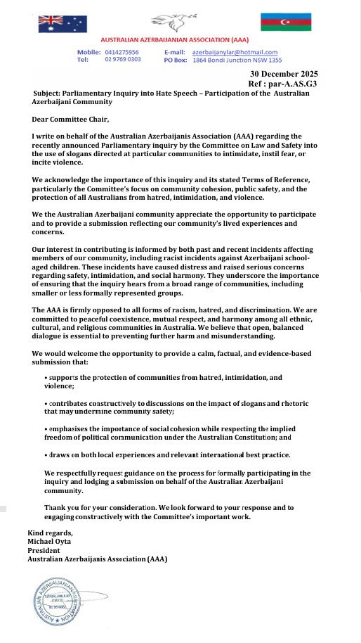 گادتب-نین مطبوعات مرکزینه داخیل اولان معلوماتا گؤره، آوسترالییا آذربایجان آسوسیاسییاسینین پرئزیدئنتی، گونئی آذربایجان دئموکراتیک تورک بیرلیگینین (گادتب) بئین الخالق علاقهلر دئپارتامئنتینین صدری سایین میکائیل بی اویتا آوسترالییا پارلامئنتینده آذربایجان و تورکیهیه قارشی ائرمنی، آیسور و یونان ایجمالارینین فیتنه کارلیغیندان خبر توتان کیمی بو فیتنه کارلیقلا موباریزه مقصدیله مکتوبلا مراجعت ائدیب و حاضردا مکتوبا جاواب دا گلیب.