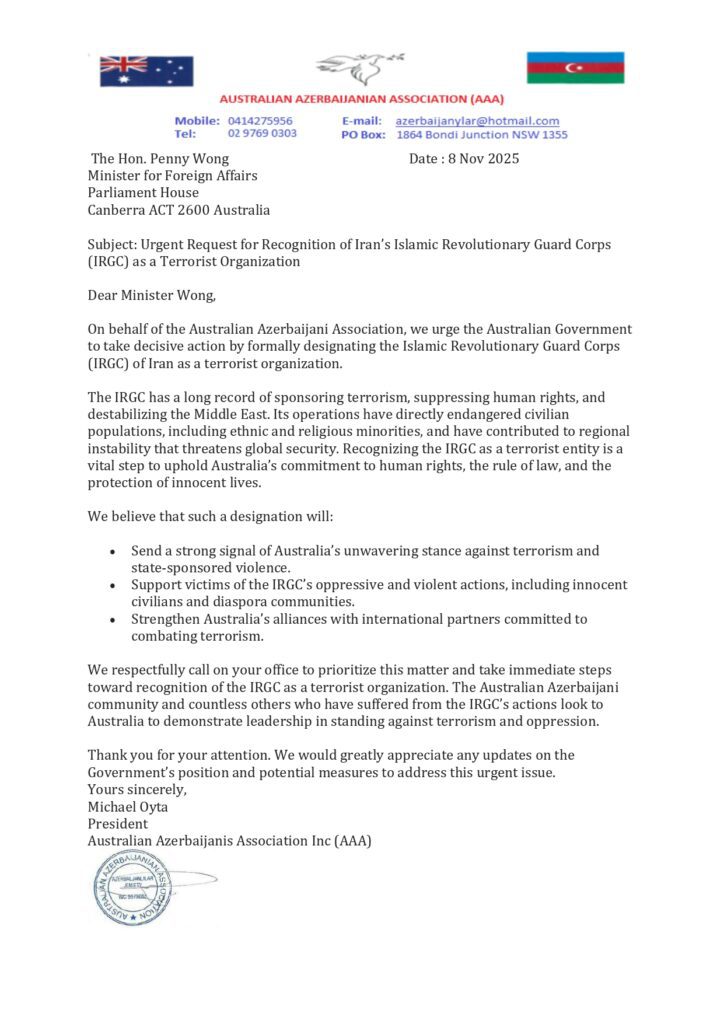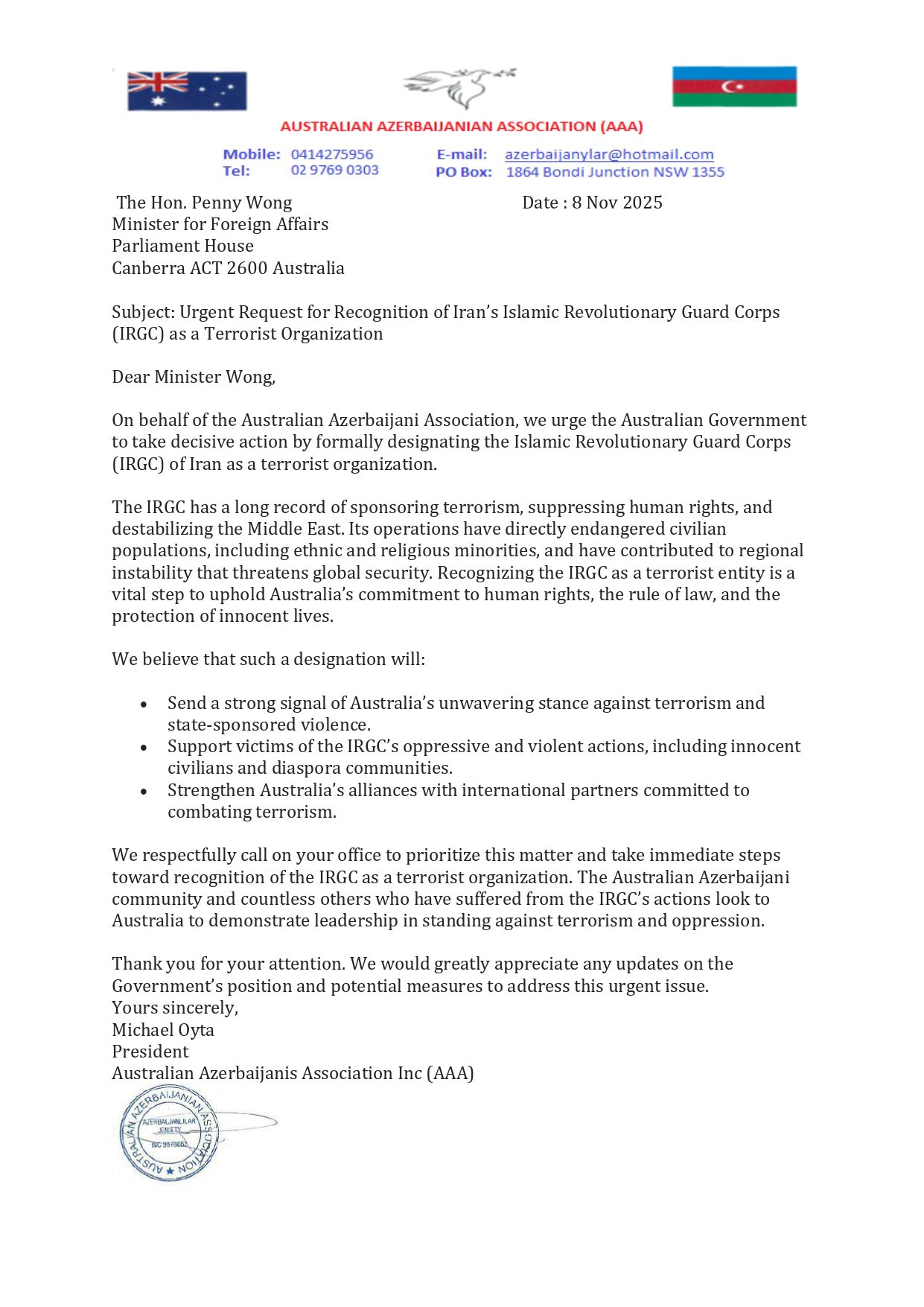 سیزدن خواهیش ائدیریک کی، بو مسئلهیه پریوریتئت یاناشاسینیز و سپاهین تئررور تشکیلاتی کیمی تانینماسی ایستیقامتینده درحال آددیملار آتاسینیز. آوسترالییا آذربایجانلیلاری ایجماسی و سپاهین عمللریندن اذیت چکمیش سایسیز-حسابسیز اینسانلار آوسترالییادان تئرروریزمه و ظلمه قارشی لیدئرلیک نوماییش ائتدیرمهسینی گؤزله ییرلر.