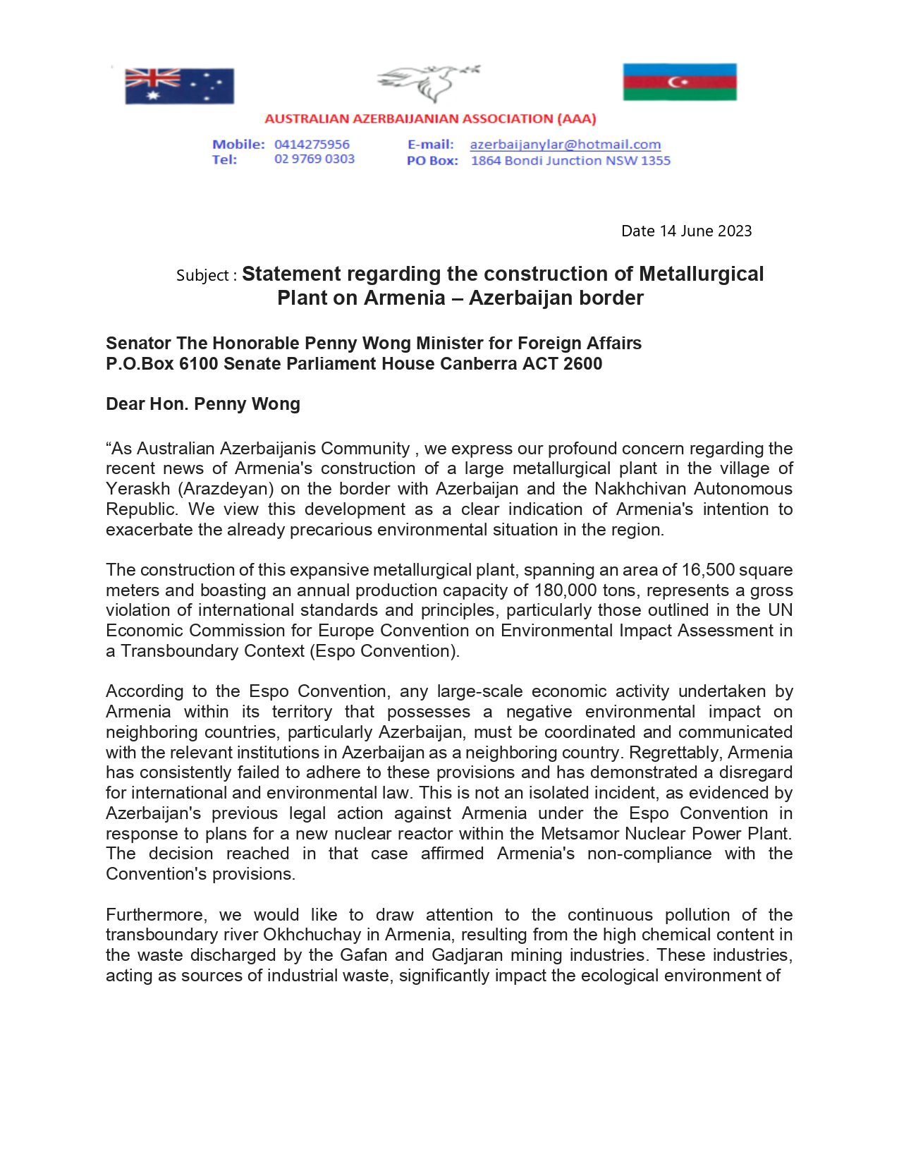 گادتب-نین مطبوعات مرکزینه داخیل اولان معلوماتا گؤره، آوسترالیا آذربایجان آسوسیاسییاسینین پرئزیدئنتی، گونئی آذربایجان دئموکراتیک تورک بیرلیینین (گادتب) بئین الخالق علاقه‌لر دئپارتامئنتینین صدری سایین میکائیل بی اویتا ائرمنیستانین ائرمنیستان-آذربایجان سرحدین‌ده مئتاللورگییا زاوودونون تیکینتی‌سی ایله باغلی آوسترالیانین خاریجی ایشلر ناظری پئننی وونگا مکتوبلا مراجعت ائدیب.