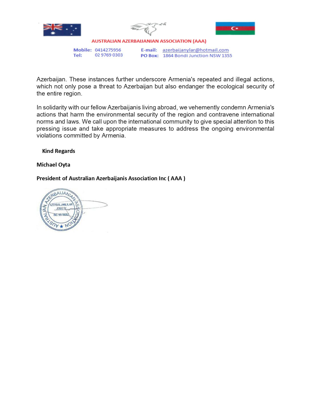سایین میکاییل بی اویتا مکتوبونون بیر حیسه‌سین‌ده یازیر: «آوسترالیا آذربایجان‌لیلاری ایجماسی اولاراق بیز ائرمنیستانین آذربایجان و ناخچیوان موختار رئسپوبلیکاسی ایله سرحدده یئرلشن یئراسخ (آرازدئیان) کندین‌ده ایری مئتاللورگییا زاوودو تیکمه‌سی ایله باغلی سون خبرلردن درین ناراحاتلیغیمیزی بیل‌دیریریک. بیز بو حادثه‌نی ائرمنیستانین رئگیون‌دا اونسوز دا تهلوکه‌لی اولان ائکولوژی وضعیتی گرگینلش‌دیرمک نیتینین باریز گؤستریجی‌سی کیمی قیمتلندیریریک.