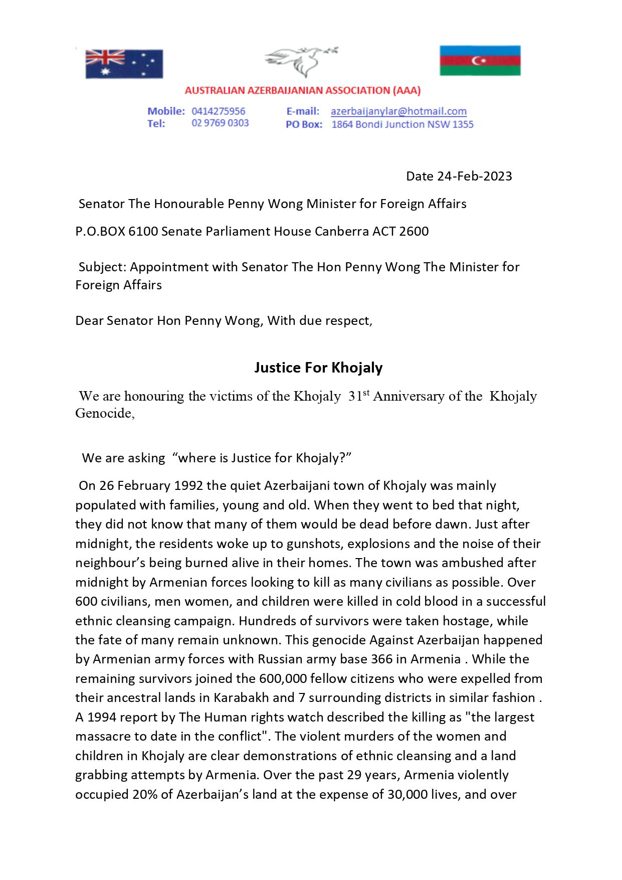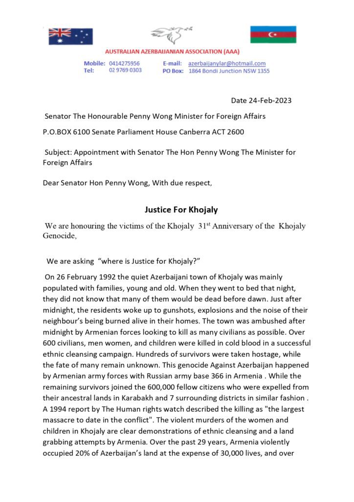 گادتب-نین مطبوعات مرکزینه داخیل اولان معلوماتا گؤره، آوسترالیا آذربایجان آسوسیاسیاسینین پرئزیدئنتی، گونئی آذربایجان دئموکراتیک تورک بیرلیگینین (گادتب) بئین الخالق علاقهلر دئپارتامئنتینین صدری سایین میکائیل بی اویتا خوجالیدا ائرمنیلرین آذربایجانلیلارا قارشی تؤرتدیگی سویقیریمین ایل دؤنومو ایله باغلی آوسترالییانین خاریجی ایشلر ناظری پئننی وونگا مکتوبلا مراجعت ائدهرک، بو دهشتلی سویقیریم بارهده معلومات وئرمیشدی.