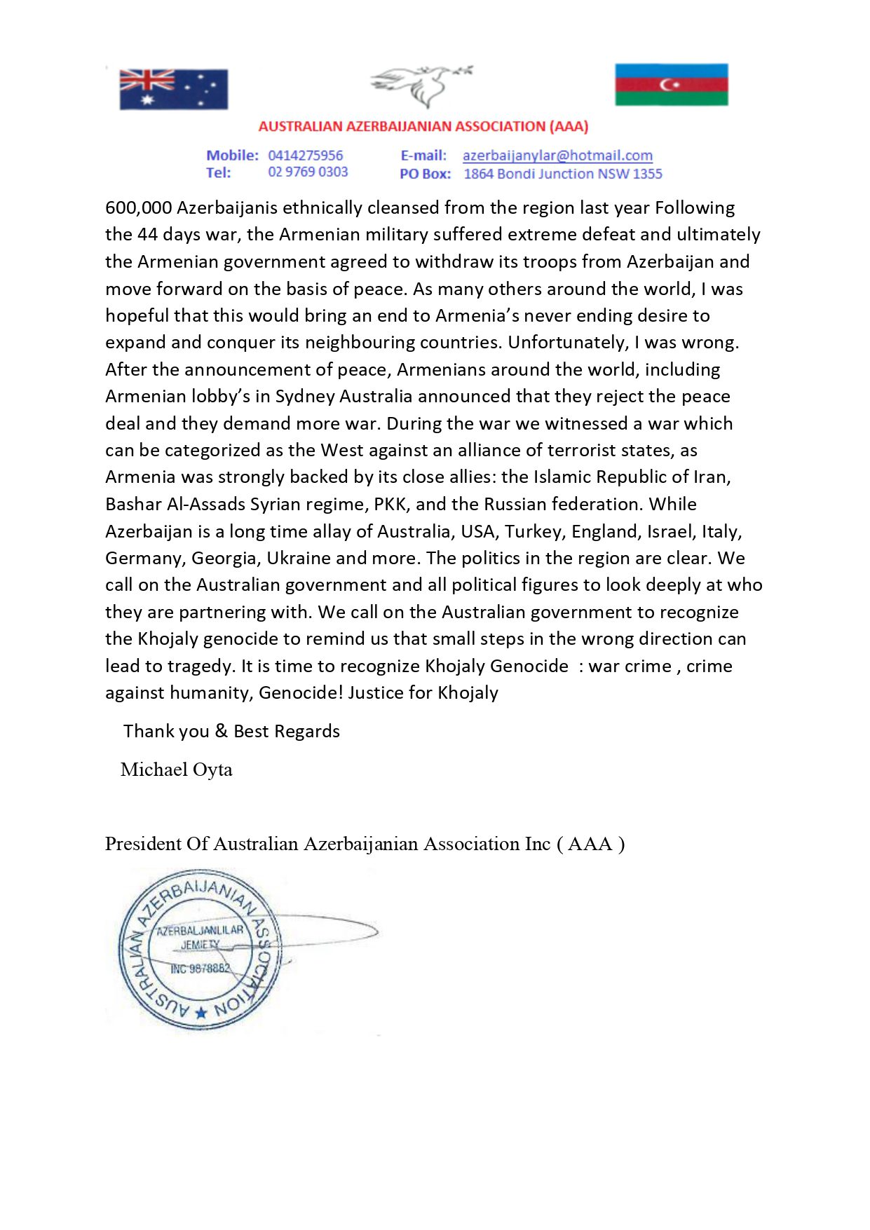 سایین میکائیل بی آوسترالیالی ناظره ائرمنیلرین آزربایجانین خوجالی شهرینه 1992-جی ایلین فئورالیندا هجوم ائدیب، شهری یئر اوزوندن سیلمکله دهشتلی سویقیریم تؤرتدیگی، ائرمنیستانین اؤز متفقلری- روسیا، ایران، سوریا و پ ک ک تئررور تشکیلاتینین کمکینه آرخالاناراق صلح سازیشینی رد ائتدیگی و سایر مسئلهلر بارهده معلومات وئریب .