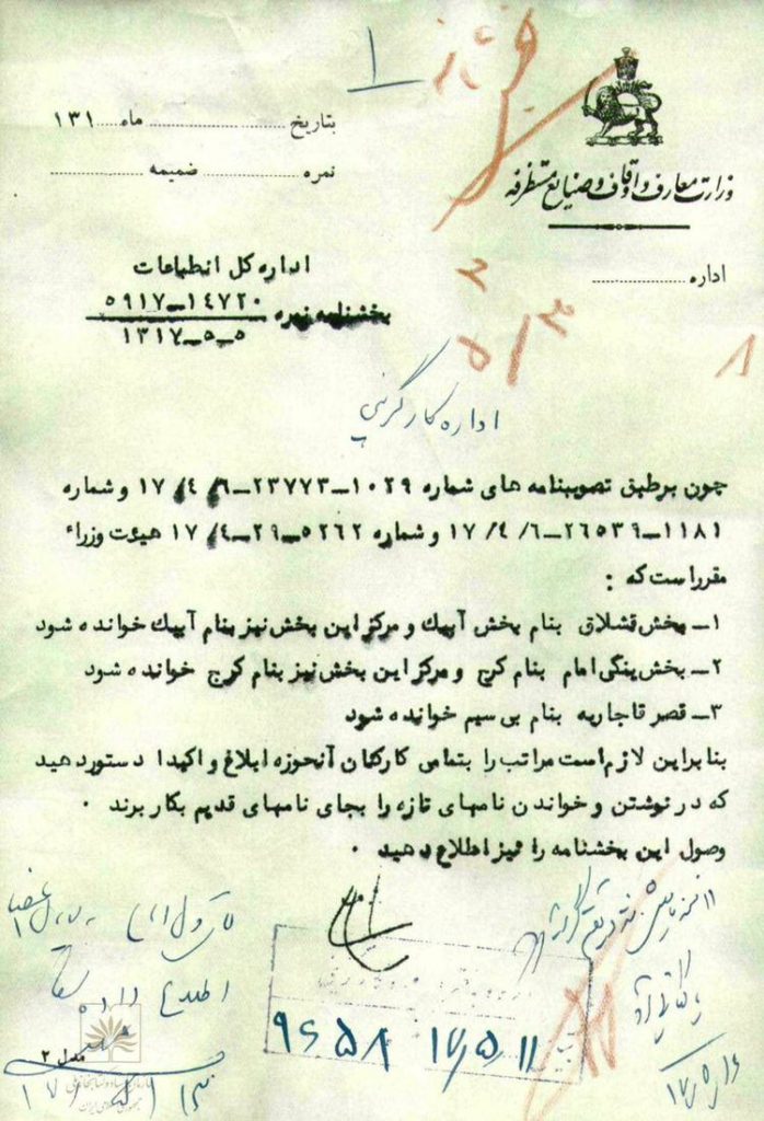 خوانده شود. بنابراین لازم است مراتب را به تمام کارکنان آن حوزه ابلاغ و اکیدا دستور دهید که در نوشتن و خواندن نامهای تازه را به جای نامهای قدیم به کار برند…”