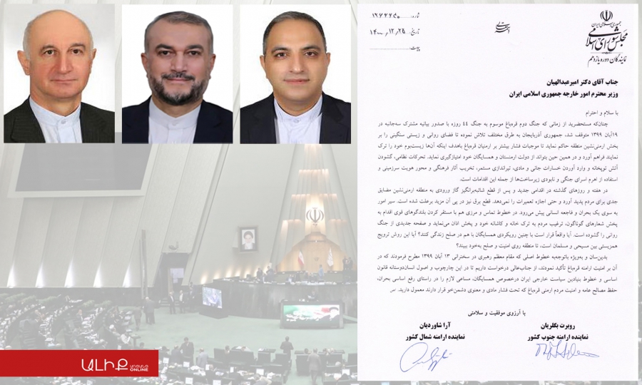 در این نامه اعتراضی که توسط دو نماینده ارمنی حاضر در مجلس ایران خطاب به وزارت امور خارجه جمهوری اسلامی نوشته شده ملت آزربایجان دشمن و‌ پخش اذان از مساجد قاراباغ جنگ روانی قلمداد گردیده است.