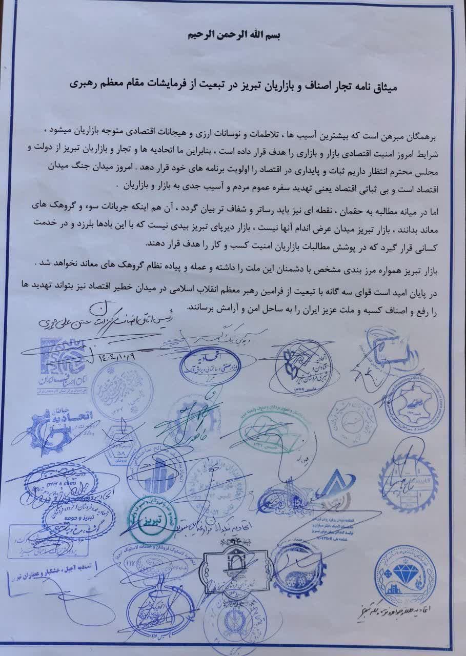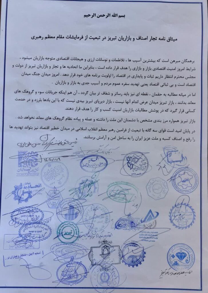 بر اساس گزارشهای دریافتی، برخی از اصناف و بازاریان تبریز در صورت پیوستن به اعتصابات و اعتراضات مردمی نسبت به گرانی، تورم و فشارهای شدید معیشتی، از سوی نیروهای امنیتی با تهدید به بازداشت مواجه شدهاند. همزمان، بیانیهای منتسب به چند کسبه تبریزی منتشر شده که در آن ضمن اشاره به نوسانات اقتصادی، بر «تمکین به قانون» و «تبعیت از منویات رهبر جمهوری اسلامی» تأکید شده است. در بخشی از این بیانیه آمده است که بازار تبریز «میدان عرضاندام جریانات سوء و گروهکهای معاند نیست» و تصریح شده که بازار «عمله و پیادهنظام گروهکهای معاند» نخواهد شد.