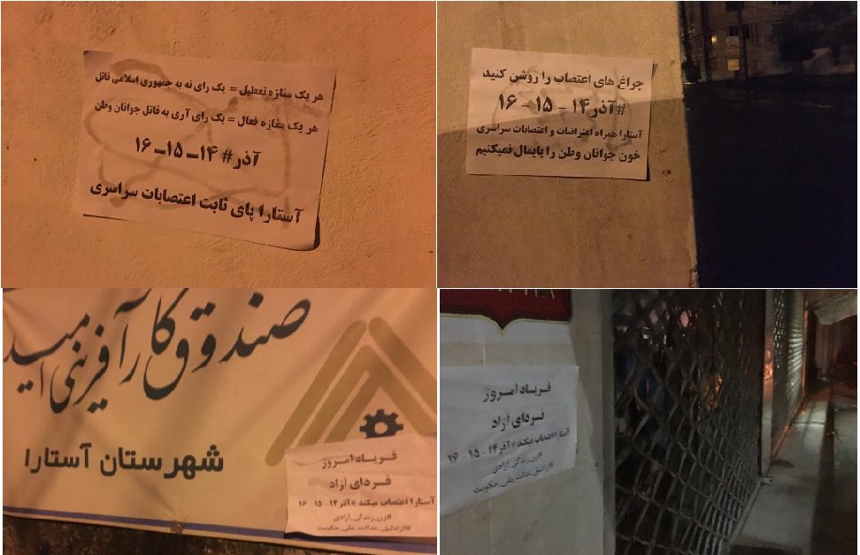 گادتب: به گزارش مرکز خبر گادتب، جوانان و فعالین آستارا با نصب پوستر و پخش تراکت‌های اعتراضی ، حمایت اهالی، کسبه و بازاریان آستارا را از اعتصابات سراسری #آذر_۱۴_۱۵_۱۶  اعلام نمودند.