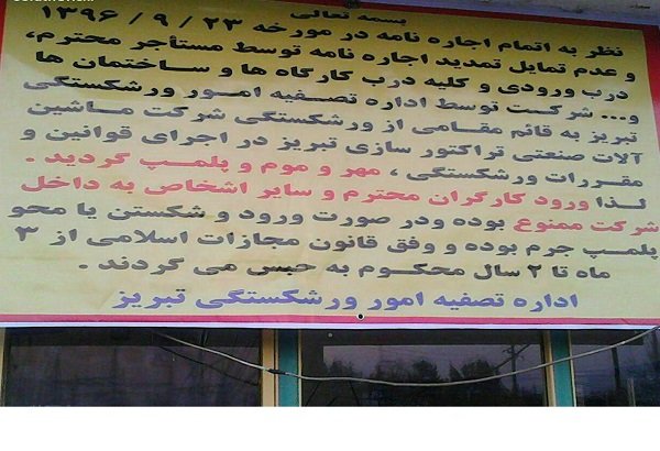 در بنر درب ورودی کارخانه ماشین آلات صنعتی تراکتورسازی تبریز که توسط اداره تصفیه امور ورشکستگی تبریز نصب شده، نوشته شده است: ” نظر به اتمام اجاره نامه در مورخه ۹۶/۹/۲۳ و عدم تمایل تمدید اجاره نامه توسط مستاجر محترم درب ورودی و کلیه درب کارگاه ها و ساختمان ها و … شرکت توسط اداره تصفیه امور ورشکستگی تبریز به قائم مقامی از ورشکستگی شرکت ماشین آلات صنعتی تراکتورسازی تبریز در اجرای قوانین و مقررات ورشکستگی مهر و موم و پلمب گردید. لذا ورود کارگران و سایر اشخاص به داخل شرکت ممنوع بوده و در صورت ورود و شکستن یا محو پلمب جرم بوده و وفق قانون مجازات اسلامی از ۳ ماه تا ۲ سال محکوم به حبس می گردند”.