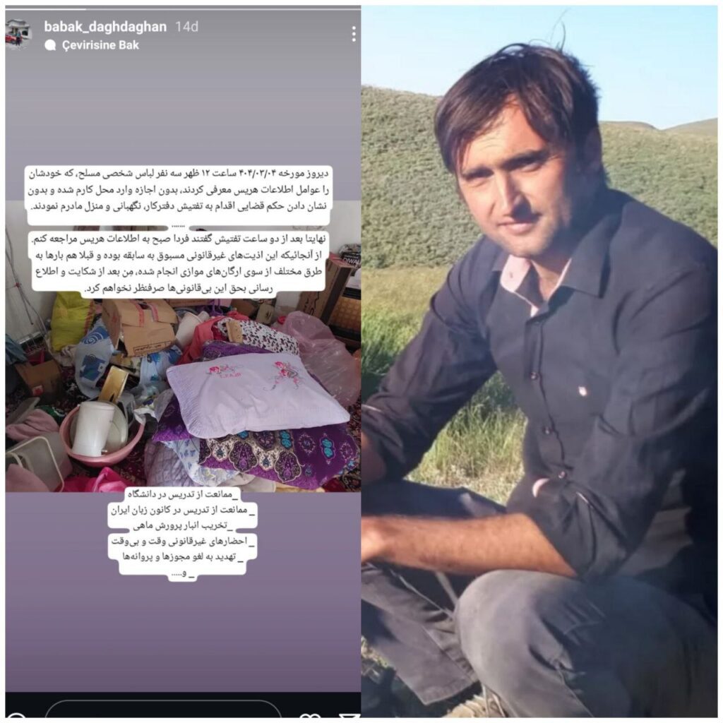 گادتب: «بابک اسدی داغداغان» فعال آزربایجانی و استاد اخراجی دانشگاه، در صفحه اینستاگرامی خود نوشت: روز چهارم خرداد ۱۴۰۴ ماموران لباس شخصی مسلح که خودشان را به عوامل اطلاعات هریس معرفی میکردند، بدون نشان دادن مجوز به تفتیش محل کار، نگهبانی و منزل مادرشان بدون حکم قضایی، پرداختند و بعد از ۲ساعت تفتیش به اطلاعات احضارکردند