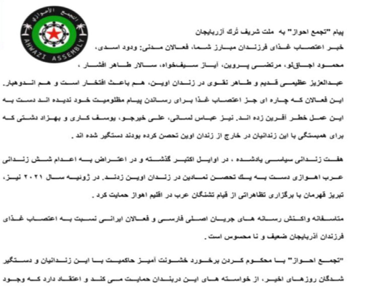 “تجمع احواز” با محكوم كردن برخورد خشونت آميز حاكميت با اين زندانيان و دستگير شدگان روزهاى اخير، از خواسته هاى اين دربندان حمايت مى كند و اعتقاد دارد كه وجود زنده و تندرست اين عزيزان براى پيكار آينده ملت آذربايجان و ساير ملل ايران سودمندتر است.