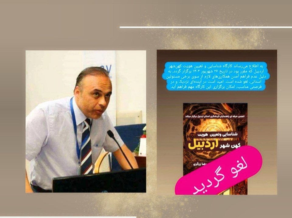 گادتب: کارگاه تخصصی شناسایی و تعیین هویت کهنشهر اردبیل با سخنرانی دکتر رضا زرگری، نویسنده و تاریخپژوه اردبیلی، که قرار بود روز چهارشنبه ۲۶ شهریور ۱۴۰۴ در سالن ختایی شهر اردبیل برگزار شود، به دستور مسئولین استانی و بدون ارائه هیچ توضیحی لغو شد.