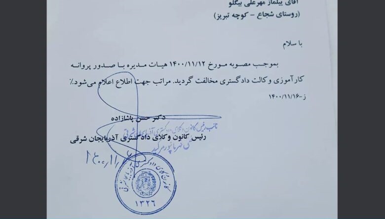 گادتب: به گزارش مرکز خبر گادتب، ییلماز مهر علی بیگلو فعال آذربایجانی و دانشآموخته حقوق روز گذشته در صفحه اینستاگرامی خود از دراینباره نوشت: امروز پس از مراجعه به کانون پیگیر وضعیت پروانه خود شدم که بنا به توضیحات رئیس کانون ,حسن پاشازاده متوجه شدم، مبنای تصمیم کانون، نامه دستوری از طرف مدیرکل اداره اطلاعات آذربایجان شرقی بوده است.