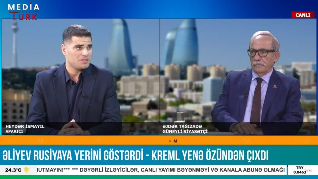 گادتب-نین مطبوعات مرکزینه داخیل اولان معلوماتا گؤره، گونئی آذربایجان دئموکراتیک تورک بیرلیگینین (گادتب) باشقانی سایین اژدر بی تاغیزاده «مئدیا تورک تی وی»-ده «علیئو روسییایا یئرینی گؤستردی – کرئمل یئنه اؤزوندن چیخدی» موضوعسوندا چیخیش ائدیب.