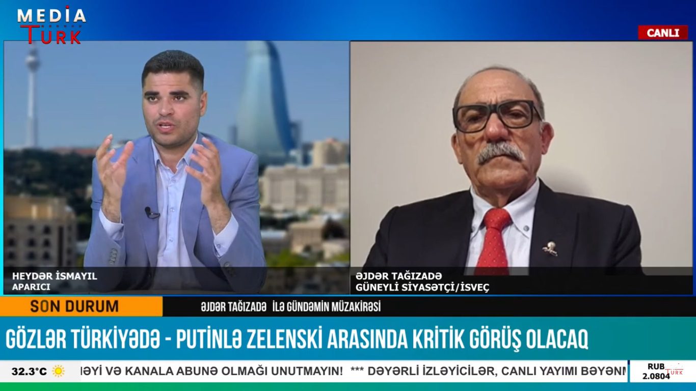 گادتب-نین مطبوعات مرکزینه داخیل اولان معلوماتا گؤره، گونئی آذربایجان دئموکراتیک تورک بیرلیگینین (گادتب) باشقانی سایین اژدر بی تاغیزاده «مئدیا تورک تی وی»-ده «گؤزلر تورکیهده – پوتینله زئلئنسکی آراسیندا کریتیک گؤروش اولاجاق» موضوعسوندا چیخیش ائدیب.