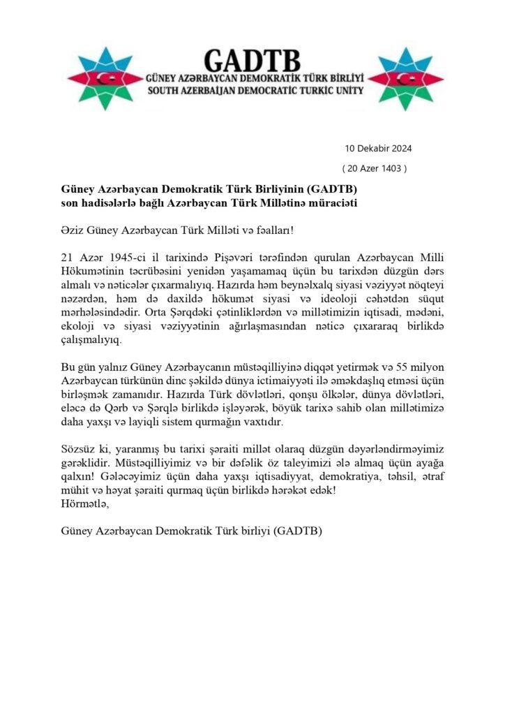 گادتب-نین مطبوعات مرکزینه داخیل اولان معلوماتا گؤره، گونئی آذربایجان دئموکراتیک تورک بیرلیگینین (گادتب) سون حادثهلرله باغلی آذربایجان تورک میللتینه مراجعت عنوانلاییب. مراجعتی اولدوغو کیمی تقدیم ائدیریک: