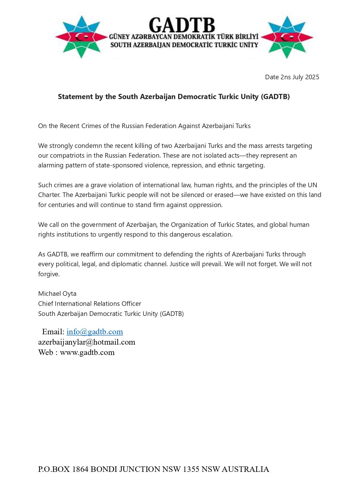 Statement by the South Azerbaijan Democratic Turkic Unity (GADTB)