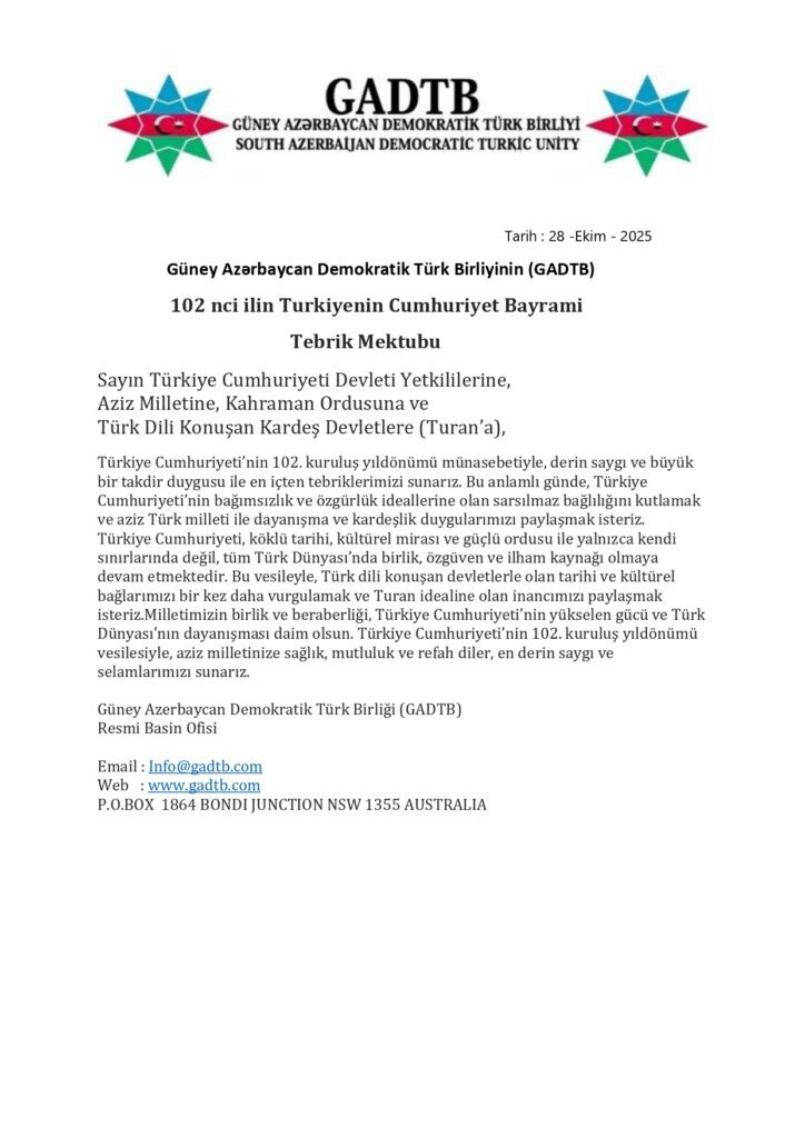 GADTB: Güney Azərbaycan Demokratik Türk Birliyi (GADTB) 29 Oktyabr – Türkiyə Cümhuriyyətinin qurulmasının ildönümü münasibətilə təbrik mesajı yayıb.