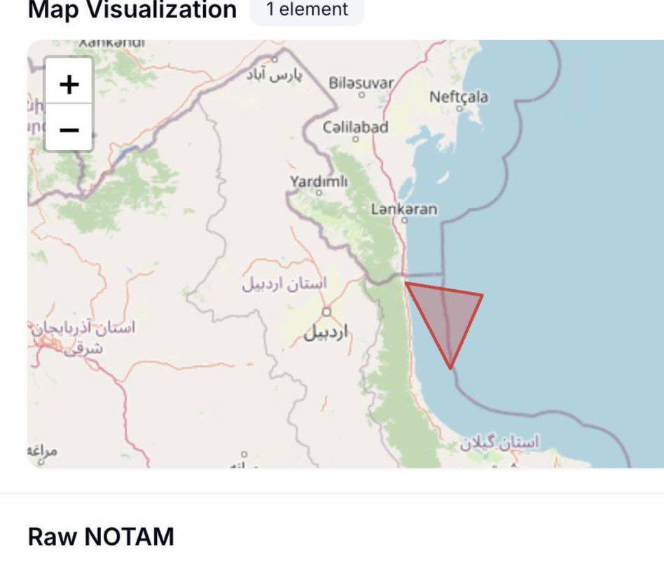 GADTB: Bu gün Tehran İran–Azərbaycan sərhədi boyunca hava məkanına dair NOTAM (uçuşlara xəbərdarlıq bildirişi) yayımlayıb. Bildiriş müəyyən ərazilərdə uçuş məhdudiyyətlərini nəzərdə tutur.