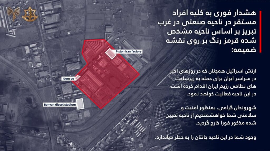 Məlumata görə, xəritədə qırmızı rənglə göstərilən əraziyə yaxın olan bütün şəxslərə həmin bölgəni dərhal boşaltmaq çağırışı edilib. Açıqlamada bildirilir ki, İsrail ordusu son günlərdə Tehran ətrafında İranın hərbi infrastrukturuna qarşı həyata keçirdiyi əməliyyatlara bənzər fəaliyyətləri yaxın saatlarda bu ərazidə də həyata keçirə bilər.