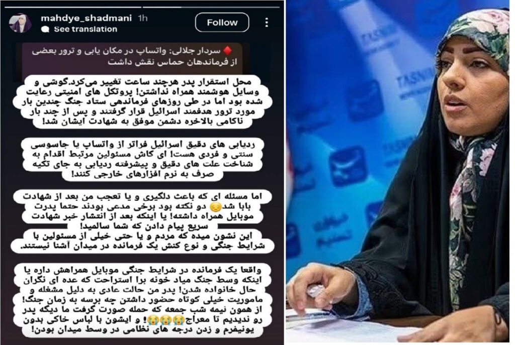 Məhdiye Şadmani deyib ki, onun atası İsrail tərəfindən öldürülən SEPAH generalı Əli Şadmani smartfondan istifadə etməyib və olduğu məkanı mütəmadi olaraq dəyişib.