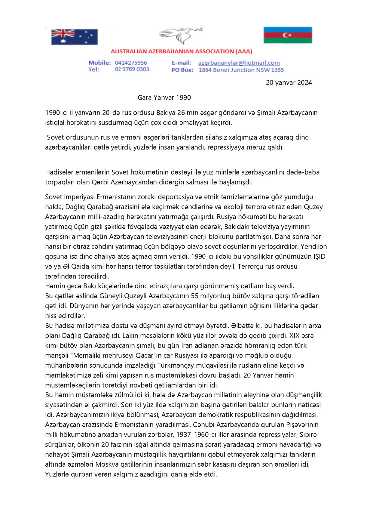 Biz Avstraliya Azərbaycan Assosiasiyası olaraq bütöv Azərbaycanımızın milli maraqları nöqteyi-nəzərindən çıxış edirik. 55 milyonluq Azərbaycan xalqı ilə həmrəy olaraq bildiririk ki, əvvəlki dövrlərdən fərqli olaraq bu il Qara Yanvarın ildönümündə şəhidlərimizin ruhunu yad etməklə yanaşı, bu günü millətimizin düşmənlərinə qarşı etiraz gününə çevirməliyik. Hörmətli Ali Baş Komandan, İlham Əliyevin dediyi kimi, hamımız bir yumruq kimi olmalıyıq. Güney Azərbaycanda səslənən “Rus, Fars, Erməni Azərbaycan düşməni” şüarı bütün Azərbaycan üçün keçərlidir. Tarixini bilməyən və unudan millət həmişə məhbəsdə olar. Tarixmizi unutmamalıyıq.