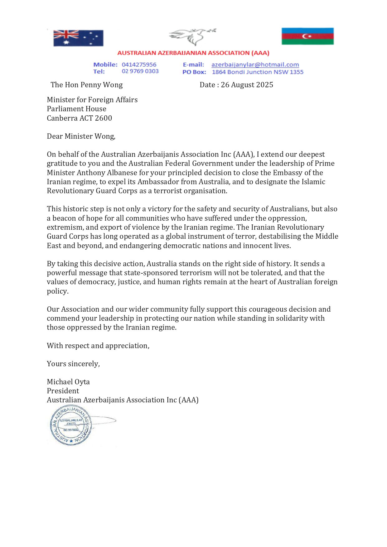 Avstraliya Azərbaycanlıları Assosiasiyası Inc (AAA) adından sizə və Baş Nazir Entoni Albanese-nin rəhbərliyi altında fəaliyyət göstərən Avstraliya Federal Hökumətinə dərin minnətdarlığımızı bildirirəm. İran rejiminin səfirliyinin bağlanması, səfirinin Avstraliyadan çıxarılması və İran İnqilab Keşikçiləri Qvardiyasının terror təşkilatı kimi tanınması barədə qəbul etdiyiniz prinsipial qərarı tam dəstəkləyirik.