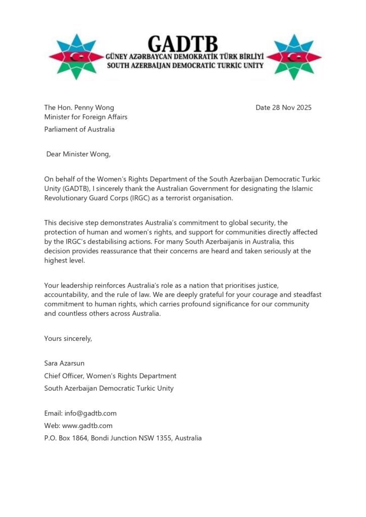 Cənubi Azərbaycan Demokratik Türk Birliyi (GADTBB) Qadın Hüquqları Departamenti adından, İran İslam İnqilabı Keşikçiləri Korpusunun (IRGC) terror təşkilatı kimi tanınmasına görə Avstraliya Hökumətinə səmimi təşəkkürümü bildirirəm.