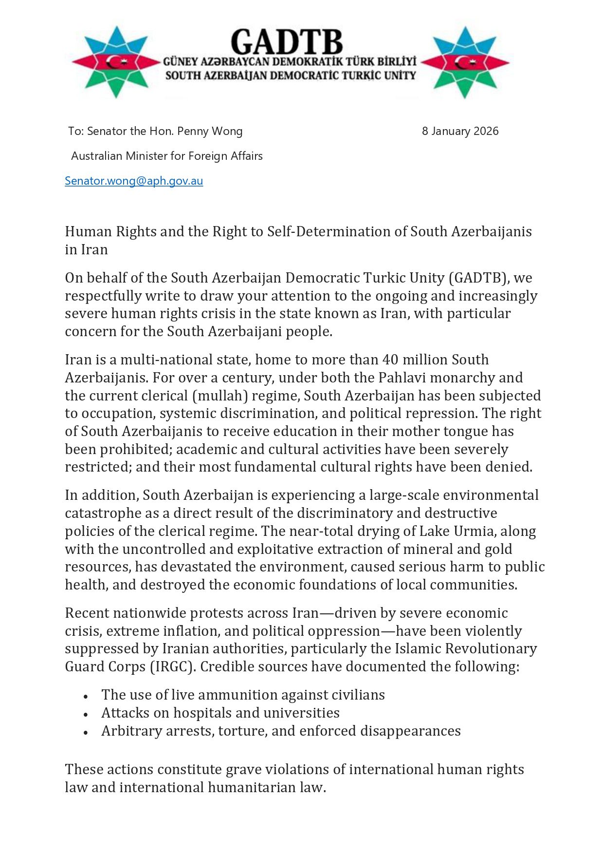 GADTB: Güney Azərbaycan Demokratik Türk Birliyi (GADTB) İnsan Haqları Departamentinin sədri sayın Sara xanım Azərsun İranda Güney Azərbaycanlıların İnsan Hüquqları və Öz Müqəddəratını Təyinetmə Hüququ ilə bağlı BMT və Avstraliya rəsmilərinə məktubla müraciət edib. İndi isə sayın Sara xanımın bu barədə Avstraliyanın Xarici işlər naziri Penni Vonqa məktubunü təqdim edirik: