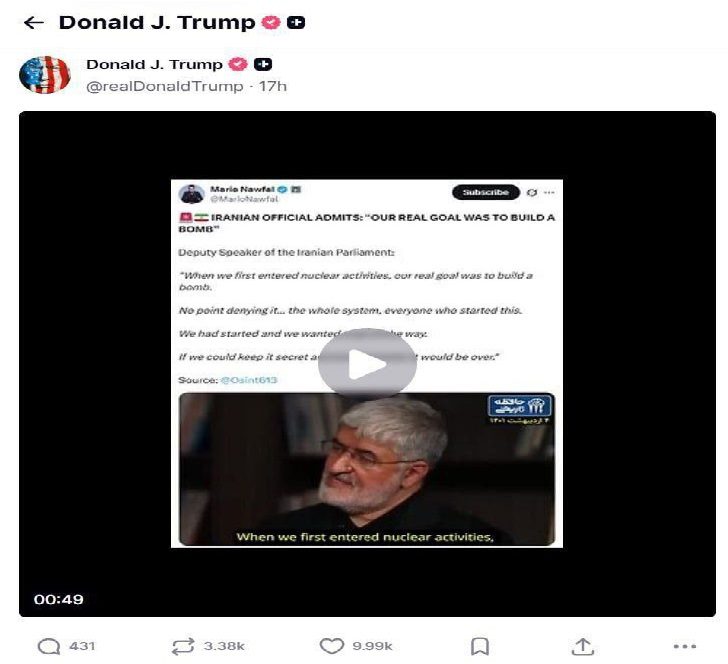 GADTB: ABŞ prezidenti Donald Tramp özünün “Truth Social” sosial şəbəkəsində İran parlamentinin keçmiş vitse-spikeri Əli Mütəhhərinin yer aldığı və İslam Respublikasının #nüvəbombası yaratmaq istəyindən birbaşa bəhs edən video yayımlayıb.