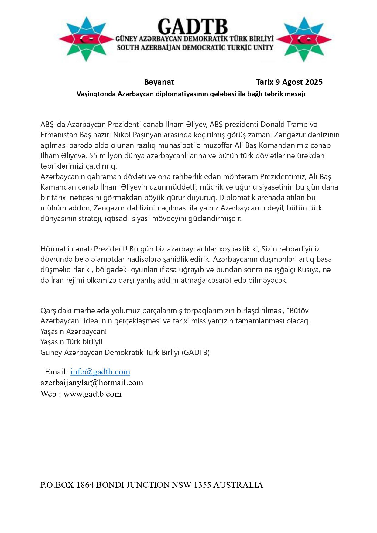 GADTB: ABŞ-da Azərbaycan Prezidenti cənab İlham Əliyev, ABŞ prezidenti Donald Tramp və Ermənistan Baş naziri Nikol Paşinyan arasında keçirilmiş görüş zamanı Zəngəzur dəhlizinin açılması barədə əldə olunan razılıq münasibətilə müzəffər Ali Baş Komandanımız cənab İlham Əliyevə, 55 milyon dünya azərbaycanlılarına və bütün türk dövlətlərinə ürəkdən təbriklərimizi çatdırırıq.