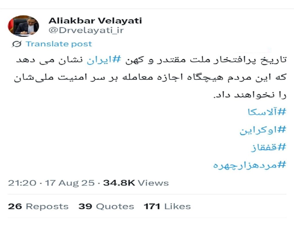 Həmin tvitdə o, “Alyaska”, “Ukrayna”, “Qafqaz” və “Mərd-e-Hezar-Çehre” (minsifətli kişi) həştəqlərindən istifadə edib.